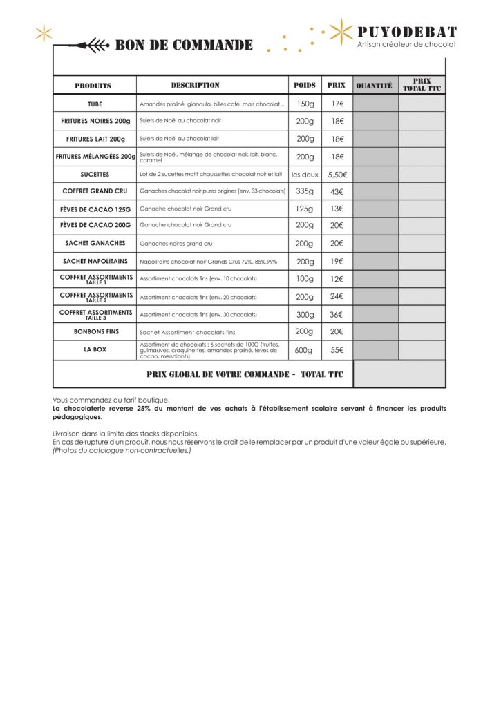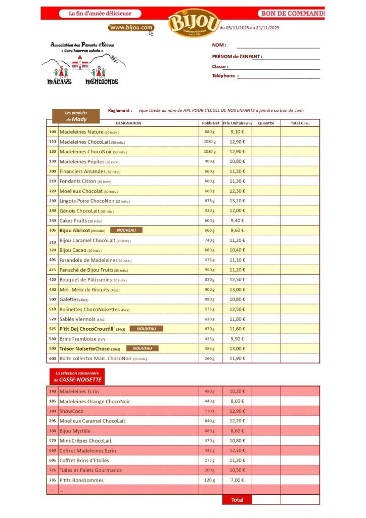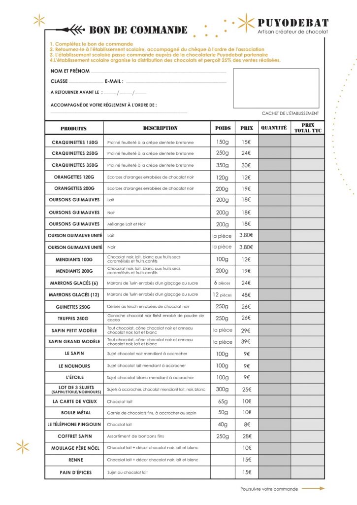 A l’occasion des fêtes de fin d’année, l’APE « Gure Haurren Eskola » fait un partenariat avec la chocolaterie Puyodebat et la pâtisserie Bijou. Vous trouverez ci-dessous les brochures des deux partenaires.