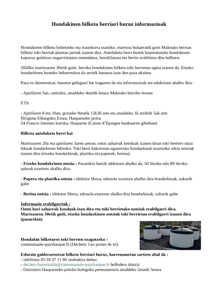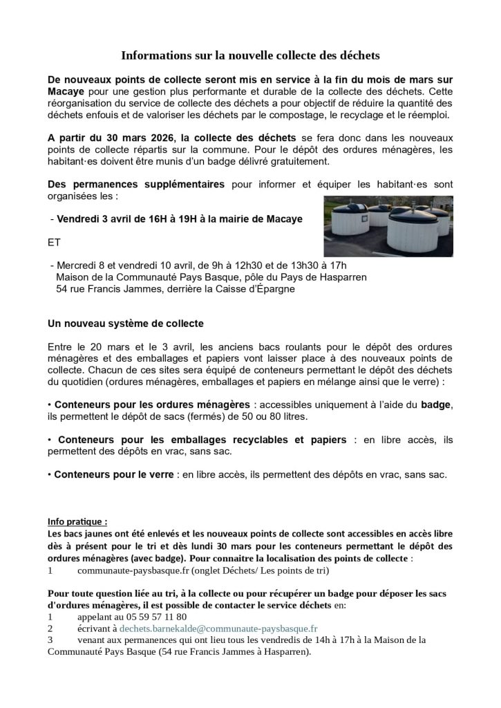 Publication publiée :28 mars 2026 Mairie de MACAYE–Makeako Herriko Etxea hondakinen bilketa berriari buruz informazioak Read more articles Article précédentEUSKO eguna 2026