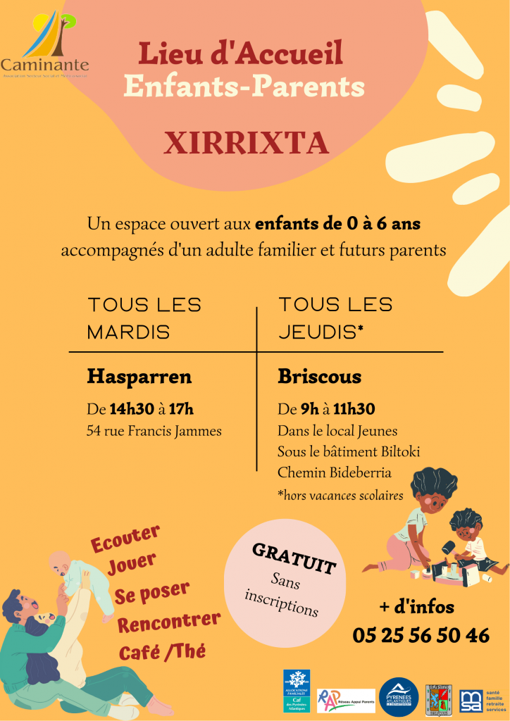 [FR] Le Lieu d’Accueil Enfants Parents (LAEP) Xirrixta est un espace convivial et accueillant ouvert aux enfants, de la naissance à 6 ans, accompagnés de leurs parents, grands-parents ou adultes familiers, quelle que soit leur commune d’habitation.