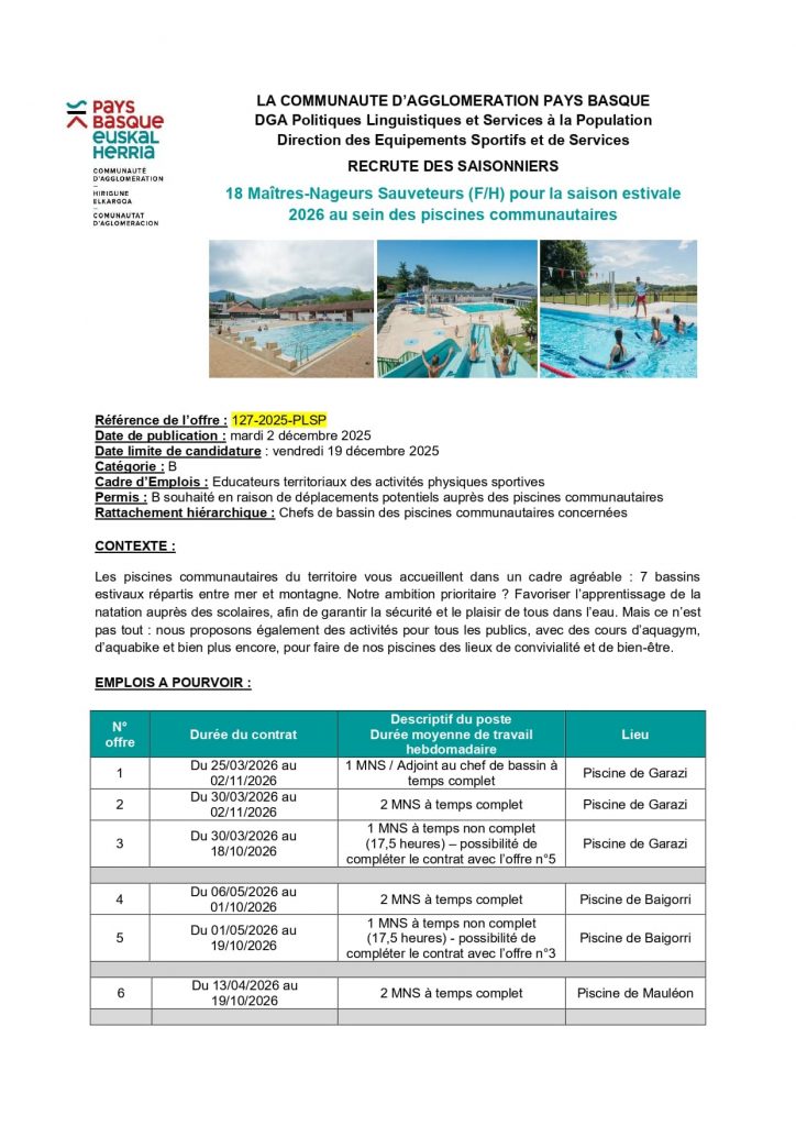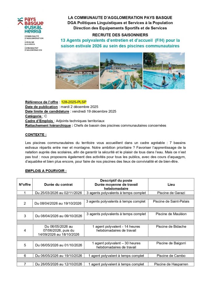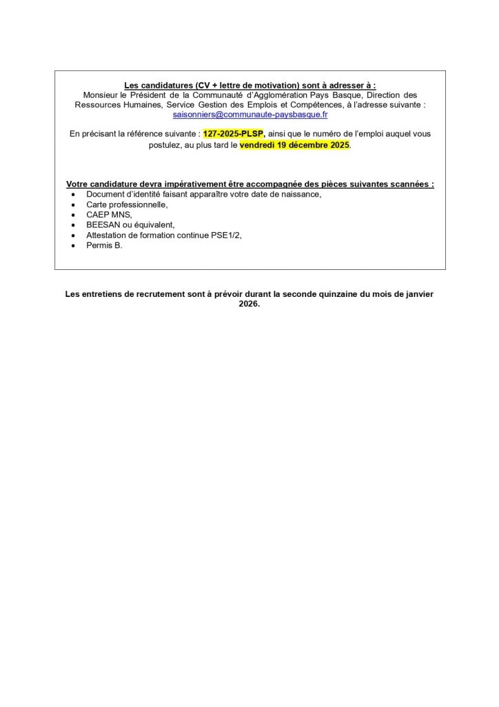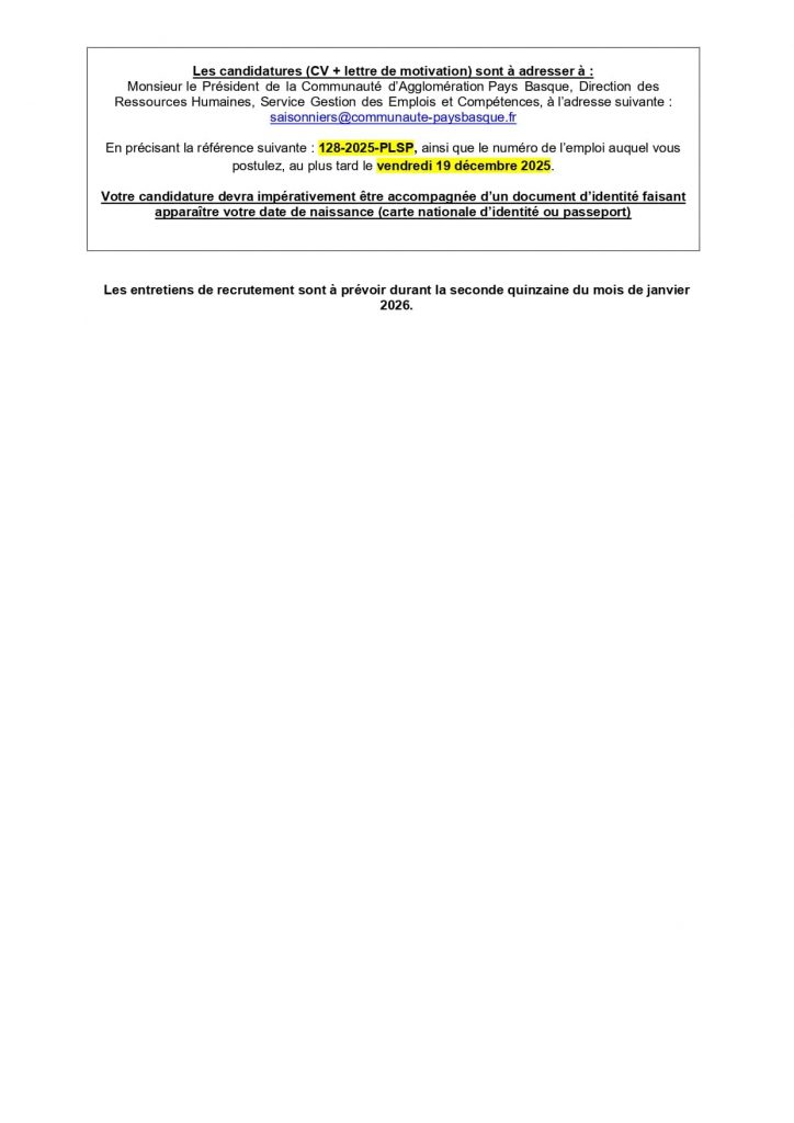 Publication publiée :15 décembre 2025 Mairie de MACAYE–Makeako Herriko Etxea Offres d’emplois à la CAPB Read more articles Article précédentOspitalea recrute ! Agent d’entretien / Agent hôtelier Article suivantMarché de Noël à MACAYE