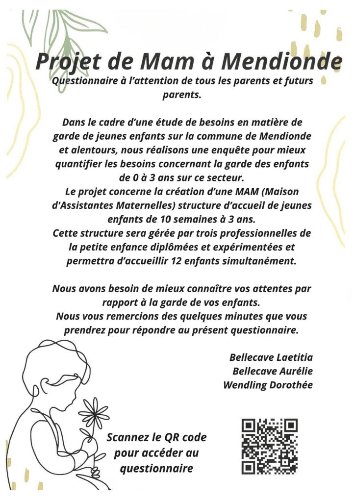 Publication publiée :15 septembre 2025 Mairie de MACAYE–Makeako Herriko Etxea Projet de MAM (Maison d’Assistantes Maternelles) à Mendionde OU cliquez sur l’affiche pour accéder au questionnaire Read more articles Article précédentDANTZA KIROLA – Irailaren 16tik goiti – 20:30 Article suivantProposition de logement à ETXE HANDIA à MACAYE